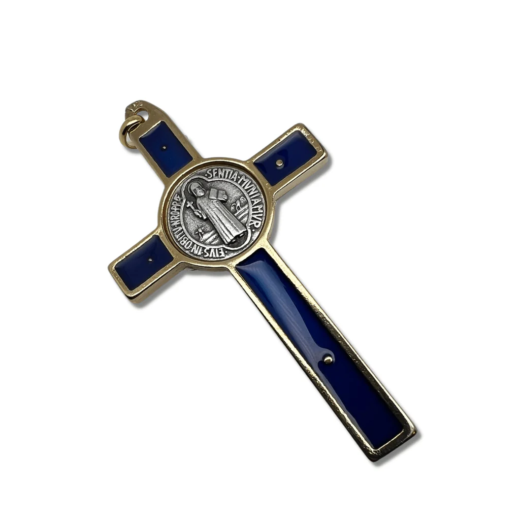 A St. Benedict crucifix with great detail. The color is BLUE enamel & golden-color metal. Of course there is also the St. Benedict medal in the front and in the back of the crucifix. It's a fantastic cross.