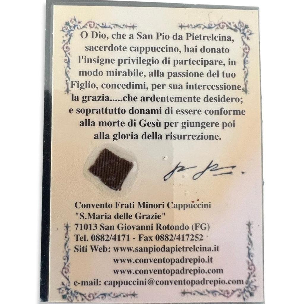 This wallet size card is very old. It comes directly from the Sanctuary and it was touched to the shrine of Saint Pio. it is encased in plastic shield, to protect it.